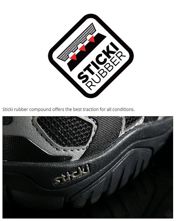 - podrážka z priľnavej gumy Sticki: gumová zmes s najlepšiu priľnavosťou vo všetkých terénnych podmienkach